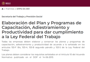 ¿Necesitas acreditar el cumplimiento en materia de capacitación de tus trabajadores? ¡Este Trámite es para ti! Elabora y conserva los planes y programas de capacitación, adiestramiento y productividad de acuerdo a lo señalado en la Ley Federal del Trabajo. Infórmate ante la autoridad responsable de la Secretaría de Trabajo y Previsión Social (STPS).
